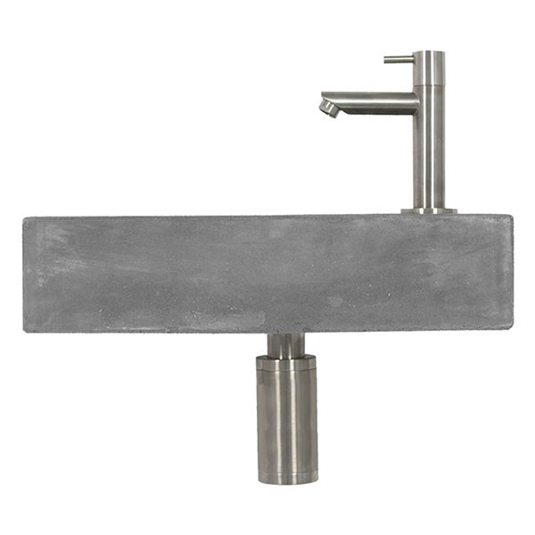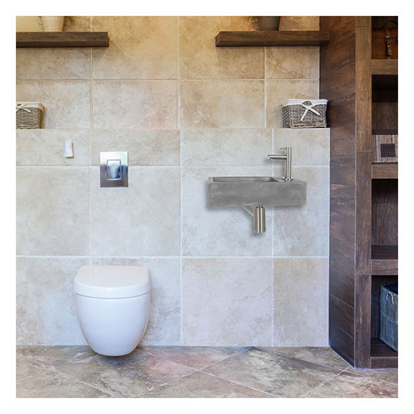 Fonteinset wc - Ben je op zoek naar een industrieel uiterlijk voor je badkamer of toiletruimte? Probeer dan deze fonteinset. Deze set bestaat uit een grijze wasbak gemaakt van beton en een moderne verchroomde kraan. De wasbak is rechthoekig van vorm en de kraan is geplaatst aan de rechterkant. Bij de set wordt een bijpassende, verchroomde sifon geleverd.