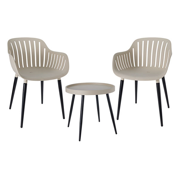 Kunststof balkonset - Met deze 3-delige balkonset zit je altijd goed, letterlijk en figuurlijk! Of je de set nu op jouw balkon plaatst of een knusse zithoek in de tuin creëert: dit is een stijlvolle toevoeging aan elke buitenruimte. De twee comfortabele stoelen en het tafeltje zijn van beige gerecycled kunststof met UV-bescherming. Zo kun je extra lang genieten van deze duurzame set.