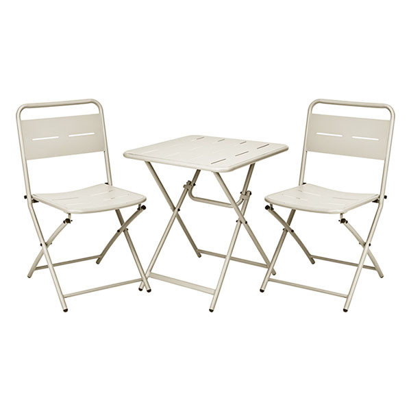 Stalen tuinset - Waan jezelf in Franse sferen, gewoon in je eigen tuin of op je balkon. Met dit beige bistrosetje geniet jij van gezellige ontbijtjes, koffiemomentjes of een knus diner, zonder dat het veel ruimte inneemt. Heb je extra ruimte nodig? Klap de stalen stoelen en het tafeltje eenvoudig in en creëer meteen meer loopruimte!