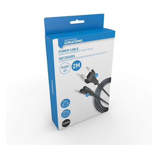 Deze C7 kabel van Grundig is ideaal voor het aansluiten van radio’s, dvd-spelers of kleine elektronische apparaten. De euro male stekker past in elk standaard stopcontact. De C7 aansluiting zorgt voor een veilige verbinding met jouw apparaat. Het platte ontwerp maakt de kabel makkelijk weg te werken achter meubels. Zo houd je jouw ruimte overzichtelijk en netjes. De kabel is gemaakt van stevig PVC en weegt 99 gram. Door het lichte en flexibele ontwerp gebruik je de kabel elke dag zonder moeite.Eigenschappen:
