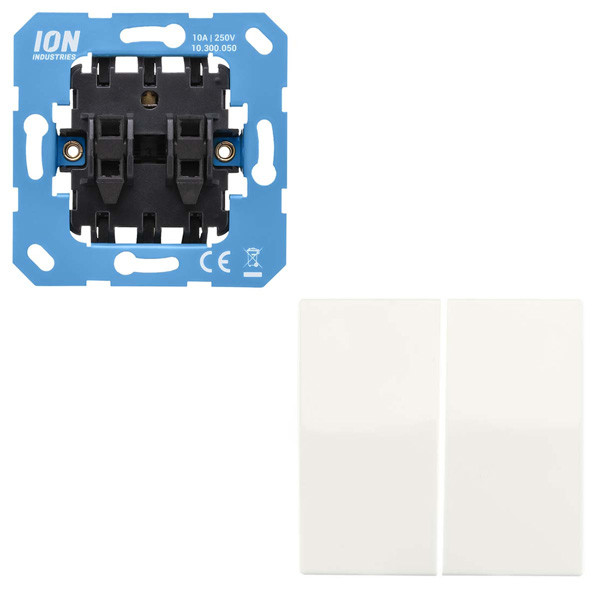 Dubbele schakelaar - Monteer deze combinatie van wissel/wisselschakelaar en bedieningsknop om meteen voorzien te zijn van je schakelmateriaal! Begin met het basiselement te installeren, en zet de witte lichtknop er gemakkelijk overheen. De lichtknop is onderdeel van de V1/J1-serie van ION, en te combineren met ander schakelmateriaal uit de serie.