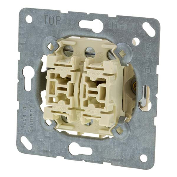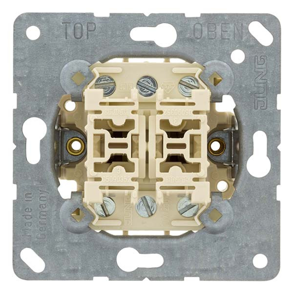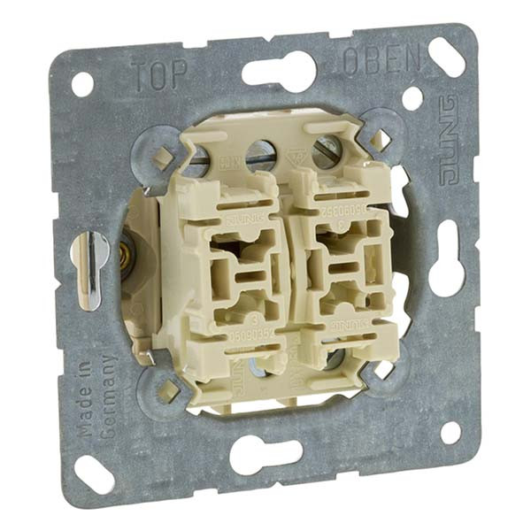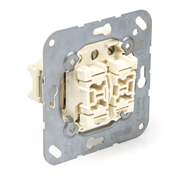 Dubbele schakelaar - Haal de basis van een wissel/wisselschakeling in huis met deze inbouwschakelaar van het merk Jung. Dit exemplaar is geschikt voor een tweevoudige wip, waarbij je twee lichtpunten aan en uit kunt zetten. Vergeet niet om de bedieningswip en afdekraam te bestellen als je deze nog niet hebt.