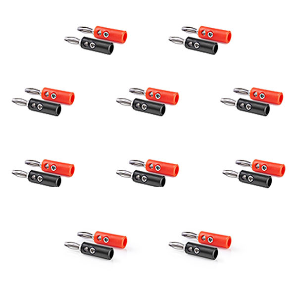 Vier mannelijke banaanpluggen - Dit setje bestaat uit vier banaanstekkers. De connectoren zijn geschikt om een luidsprekerkabel te verbinden met een speaker met een bananen ingang. Doordat de contacten vernikkeld zijn ben jij met deze pluggen altijd verzekerd van een perfecte geluidsoverdracht. Er worden in totaal 10 stuks geleverd, ideaal voor meerdere apparaten of als handige reserve.