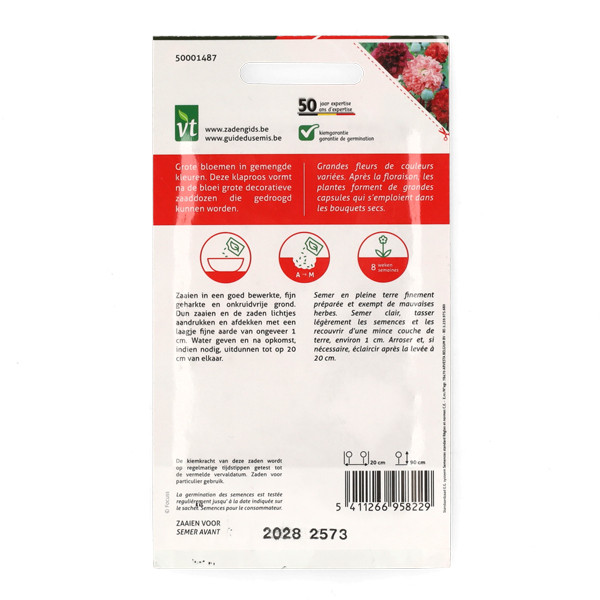 Bloemzaadjes voor klaproos - De klaproos, of ook wel de papaver genoemd, is een prachtige zomerbloem die in juli en augustus bloeit. Het is dan ook een van de geboortebloemen van de maand augustus. Dit zakje bloemzaadjes heeft een mix van kleuren voor de klaproos en kan in april en mei gezaaid worden bij een temperatuur tussen 10°C en 18°C.